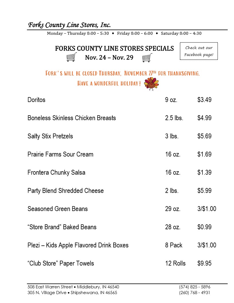 "The prices are unbelievable (seriously) 2 baby food pouches for 1 dollar. A box of 12 oreos, chips ahoy, and nutter butter snack bags for 99 cents. You literally cannot find food as cheap as some of the items at forks. Also the service is incredible. They bring the bags to your car and help you load. I'm greatly pleased with Forks, and though I live 40 minutes away. I'll be back. The only thing is I wish they had a larger selection of meats. The meat they do have is very cheap!"